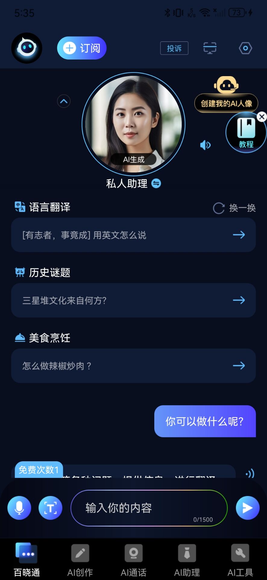 这是一款智能聊天对话、智能写作文章和AI绘画生成的软件。你可以随时随地与它对话帮你解决各式各样的难题。